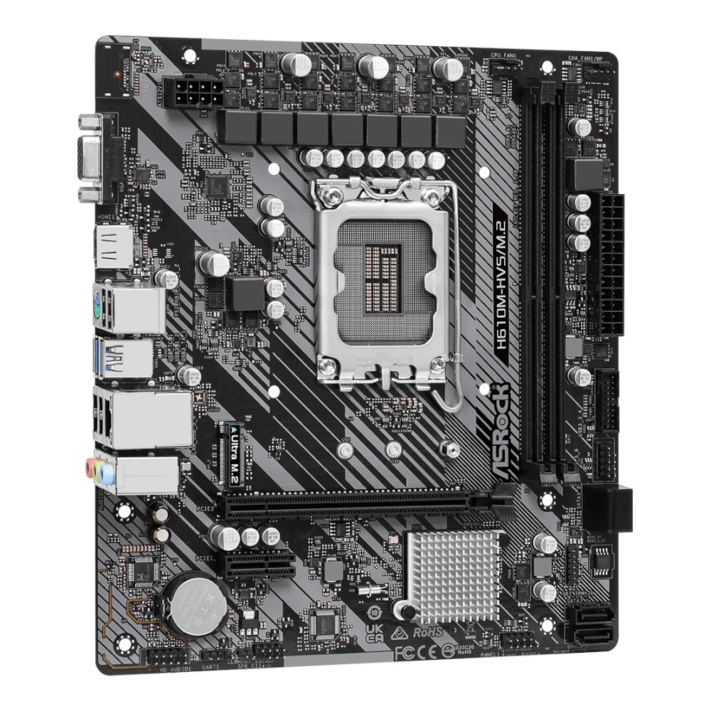 The ASRock H610M-HVS/M.2 R2.0 Intel LGA 1700 m-ATX Motherboard is a reliable and feature-packed solution for building a powerful PC. Designed to support 14th, 13th, and 12th Gen Intel® Core™ processors on the LGA 1700 socket, this motherboard ensures excellent compatibility and performance for a variety of computing tasks. Its 6+1+1 Phase Power Design ensures stable and efficient power delivery, making it ideal for everyday use and demanding workloads.