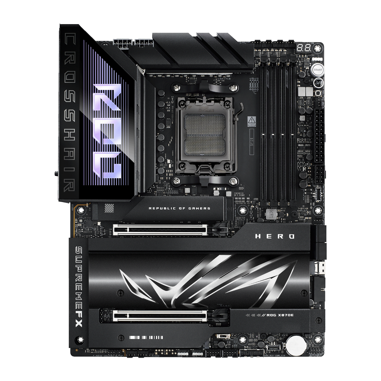 Thermal management is finely tuned with expansive VRM heatsinks, hybrid fan headers, and AI Cooling II, which intelligently balances noise and thermals with a single click. DIY builders will appreciate ASUS Q-Design for simplified assembly and error-free installation. Sync your RGB components using Aura Sync to achieve a cohesive visual setup, and enjoy pristine audio with ESS® ES9219 QUAD DAC and SupremeFX Shielding Technology. Whether you’re chasing competitive edge, professional-grade production, or cutting-edge AI performance, the ROG Crosshair X870E HERO delivers unrivaled control and power for next-gen PC builds.